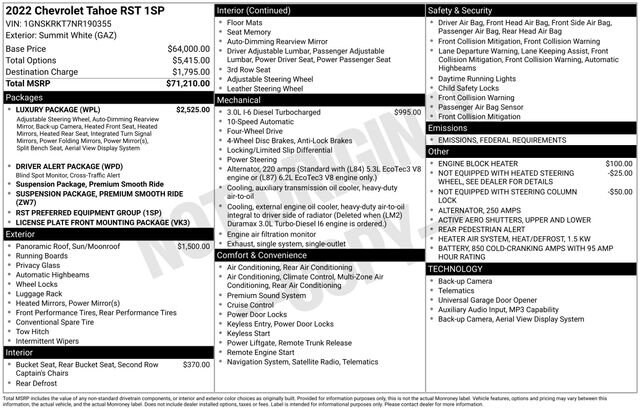 This Tahoe is loaded with premium features, including the full Luxury Package with power-folding second- and third-row seating, heated second-row seats, a heated steering wheel, HD Surround Vision, memory settings, upgraded heated mirrors, and a power tilt and telescoping steering column. The Driver Alert Package adds Lane Change Alert with Side Blind Zone Alert and Rear Cross Traffic Alert for added peace of mind. Inside, the dual-pane panoramic sunroof fills the cabin with natural light, while the Bose premium audio system and built-in Navigation make every mile more enjoyable.