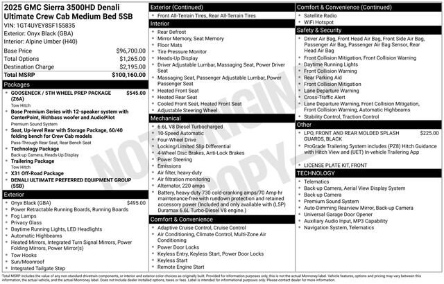 Take your drives to the next level with this GMC Sierra 3500HD from Salt Lake Valley Buick GMC! Engineered for a smooth ride, advanced convenience, and lasting dependability, this vehicle is ready to handle everything your day throws at you. Plus, enjoy a $1,000 finance savings, already included in the sale price, when you finance through one of our trusted lending partners. Looking for quality used cars in Salt Lake City? This GMC Sierra 3500HD delivers style, versatility, and value - perfect for daily commutes, family trips, or weekend adventures. Stop by Salt Lake Valley Buick GMC to see this vehicle in person and explore our wide selection of pre-owned cars, trucks, and SUVs. Browse online at www.slvbuickgmc.com or call 801-265-1511 to schedule your test drive today! With Gooseneck/5th Wheel Prep Package, Preferred Equipment Group 5SB (120-Volt Bed Mounted Power Outlet, 120-Volt Instrument Panel Power Outlet, 2 Charge-Only Rear USB Ports, 2 Charge/Data USB Ports Inside Center Console, 2 USB Ports, 2-Speed Active Transfer Case, Bed View Camera w/2 Trailer Camera Provisions, Bose Premium Series 12-Speaker System, Deep-Tinted Glass, Electric Rear-Window Defogger, Floor-Mounted Center Console, Front Rain-Sensing Wipers, HD Surround Vision, Heated 2nd Row Outboard Seats, Heated Driver & Front Outboard Passenger Seats, Hitch Guidance w/Hitch View, In-Vehicle Trailering App, Keyless Open & Start, LED Cargo Area Lighting, LED Smoked Amber Roof Marker Lamps, Manual Tilt-Wheel/Telescoping Steering Column, Power Front Windows w/Passenger Express Up/Down, Power Sliding Rear Window w/Defogger, Power Sunroof, ProGrade Trailering System, Push Button Start, Rear Cross Traffic Alert, Rear Wheelhouse Liners, Remote Vehicle Starter System, Safety Alert Seat, Signature Denali Ultimate Grille in Vader Chrome, SiriusXM w/360L Trial Subscription, Spray-On Pickup Bedliner w/GMC Logo, Steering Wheel Audio Controls, Trailer Camera Provisions, Trailer Side Blind Zone Alert, Trailer Tire Pressure Monitor Sensors, Ultrasonic Front & Rear Park Assist, Unauthorized Entry Theft-Deterrent System, Universal Home Remote, Ventilated Driver & Front Passenger Seats, Wireless Charging, and Wireless Phone Projection), Technology Package (Auto-Dimming Inside Rearview Mirror w/Camera and Multicolor 15 Diagonal Head-Up Display), X31 Off-Road Package (Hill Descent Control), 12 Speakers, 16-Way Power Driver Seat Adjuster w/Lumbar, 16-Way Power Passenger Seat Adjuster w/Lumbar, 220 Amp Alternator, 3.42 Rear Axle Ratio, 4-Wheel Disc Brakes, ABS brakes, Air Conditioning, Alloy wheels, AM/FM radio: SiriusXM with 360L, Auto High-beam Headlights, Auto-dimming door mirrors, Auto-dimming Rear-View mirror, Automatic Emergency Braking, Automatic temperature control, Black Front & Rear Molded Splash Guards (LPO), Block heater, Brake assist, Buckle to Drive, Bumpers: body-color, Compass, Delay-off headlights, Driver door bin, Driver Memory, Driver vanity mirror, Dual front impact airbags, Dual front side impact airbags, Dual Heavy-Duty 70 Amp-Hr Battery, Electronic Stability Control, Exterior Parking Camera Rear, Following Distance Indicator, Forward Collision Alert, Front anti-roll bar, Front Bucket Seats, Front Center Armrest, Front dual zone A/C, Front fog lights, Front License Plate Kit, Front Pedestrian Braking, Front reading lights, Front wheel independent suspension, Full Grain Leather Seat Trim, Fully automatic headlights, Garage door transmitter, Genuine wood dashboard insert, Genuine wood door panel insert, GMC Premium 13.4 Diagonal Information Display, Heads-Up Display, Heated door mirrors, Heated front seats, Heated rear seats, Heated steering wheel, Illuminated entry, IntelliBeam Automatic High Beam On/Off, Lane Departure Warning System, Leather steering wheel, Low tire pressure warning, Memory seat, Occupant sensing airbag, Off-Road Suspension, Outside temperature display, Overhead airbag, Overhead console, Panic al