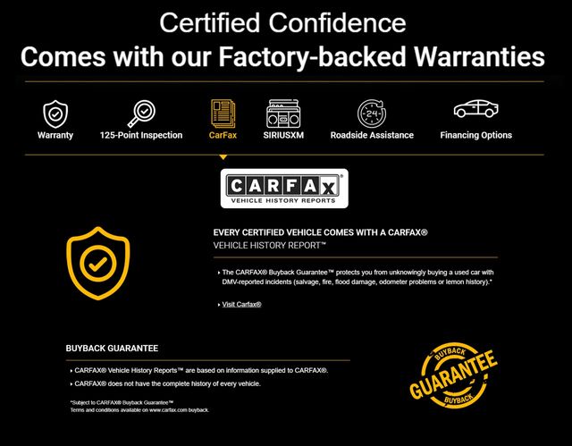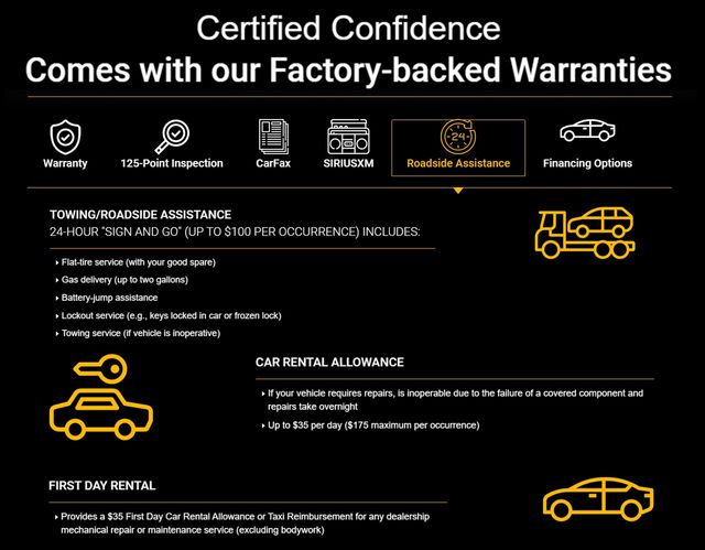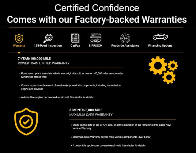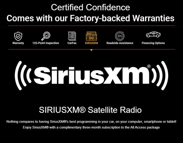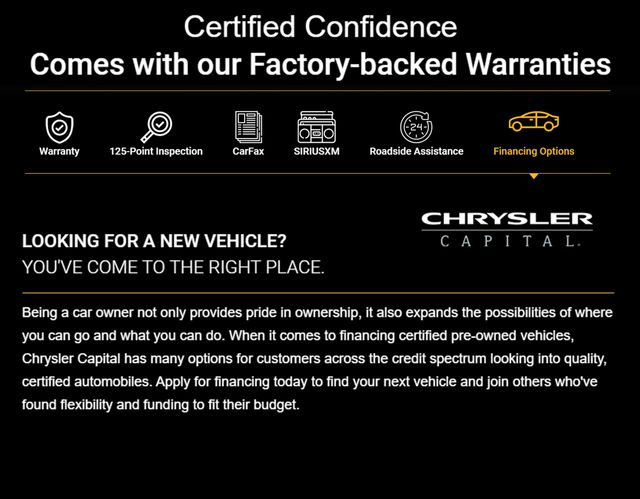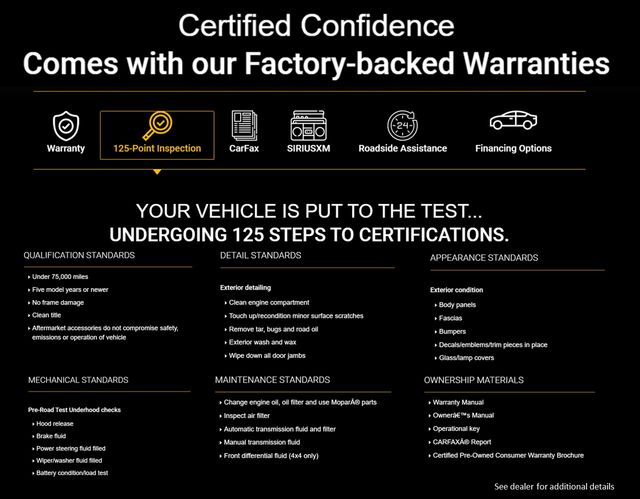 * Vehicles Up to 75,000 Miles and/or 5 Model Years. 24-Hour Towing & Roadside Assistance, Car Rental Allowance, CARFAX® Vehicle History ReportTM and an Introductory 3-month Subscription to SiriusXM® Satellite Radio & Certified Warranty Upgrades (for FCA US LLC Certified Pre-Owned program), Vehicles Between 6-10 Model Years and/or 75,001-120,000 Miles. Thorough Reconditioning Process Using Authentic Mopar Parts. 3-Month Trial Subscription for SiriusXM GuardianTM and Satellite Radio (for Certified Pre-Owned Go program), Vehicles Between 0-5 Model Years and/or 75,000 Miles. Thorough Reconditioning Process Using Authentic Mopar Parts. 12 Month/12,000 Mile Extended Care Premium Warranty, Car Rental Allowance, 3-Month Trial Subscription for SiriusXM GuardianTM and Satellite Radio (for Certified Pre-Owned Gold program)