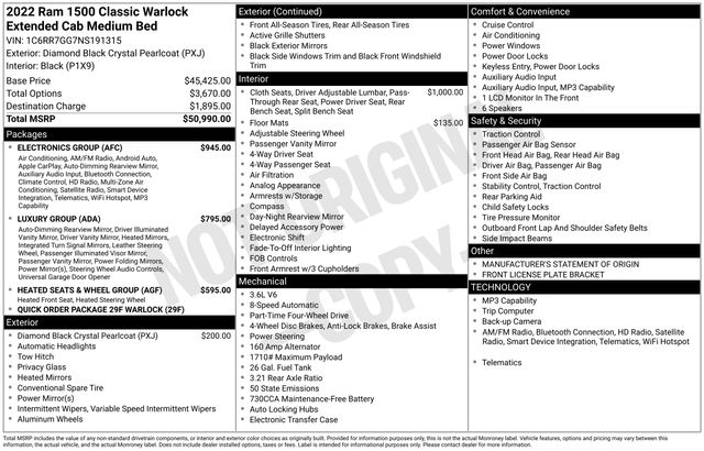 Get ready to hit the road in this Ram 1500 Classic, a standout choice for drivers looking for reliability, performance, and style! This impressive vehicle is packed with premium features designed to make every drive more enjoyable. Plus, youâll enjoy a $1,000 finance savings, already included in the sale price, when you finance through one of our trusted lending partners. Whether youâre searching for used cars in Salt Lake City, a dependable SUV, or a powerful truck, this Ram 1500 Classic delivers everything you need and more. Visit Salt Lake Valley Chrysler Dodge Jeep Ram today to test drive or explore our entire selection of quality pre-owned vehicles. Donât wait - shop online at www.slvcdjr.com or call 801-484-8755 to learn more! This amazing vehicle comes loaded with options like Electronics Group (4G LTE Wi-Fi Hot Spot, 8.4" Touchscreen Display, Air Conditioning ATC w/Dual Zone Control, Apple CarPlay, Audio Input Jack for Mobile Devices, Auto-Dimming Rear-View Mirror, Cluster 7.0" TFT Color Display, Google Android Auto, GPS Antenna Input, Integrated Center Stack Radio, Integrated Voice Command w/Bluetooth, Media Hub (2 USB, AUX), Radio: Uconnect 5 w/8.4" Display, Remote USB Port, and USB Host Flip), Heated Seats & Wheel Group (Heated Front Seats and Heated Steering Wheel), Luxury Group (Auto-Dimming Exterior Mirrors, Black Exterior Mirrors, Exterior Mirrors Courtesy Lamps, Exterior Mirrors w/Heating Element, Exterior Mirrors w/Supplemental Signals, Glove Box Lamp, Leather Wrapped Steering Wheel, LED Bed Lighting, Overhead Console w/Garage Door Opener, Power Heated Fold-Away Mirrors, Power-Folding Mirrors, Rear Dome w/On/Off Switch Lamp, Steering Wheel Mounted Audio Controls, Sun Visors w/Illuminated Vanity Mirrors, and Universal Garage Door Opener), Quick Order Package 29F Warlock (4x4 Flat Black Badge, B-Pillar Black Out, Bi-Function Halogen Projector Headlamps, Black Exterior Truck Badging, Black Grille w/RAM Lettering, Black Headlamp Filler Panel, Black Powder Coated Front Bumper, Black Powder Coated Rear Bumper, Black RAM Head Tailgate Badge, Black Wheel Flares, Front Wheel Well Liners, ParkSense Rear Park Assist System, Raised Ride Height, Rear Extra HD Shock Absorbers, Semi-Gloss Black Hub, Sport Tail Lamps, Warlock, Warlock Interior Accents, and Wheels: 20" x 9" Semi-Gloss Black Aluminum), SiriusXM Guardian - Included Trial (B) (1 Year Trial (Registration Required), For Details Visit DriveUconnect.com, and Global Telematics Box Module (TBM)), 3.21 Rear Axle Ratio, 4-Wheel Disc Brakes, 40/20/40 Split Bench Seat, 6 Speakers, ABS brakes, Active Grille Shutters, Air Conditioning, Alloy wheels, AM/FM radio: SiriusXM, Brake assist, Bumpers: chrome, Center Hub, Charge Only Remote USB Port, Cloth 40/20/40 Bench Seat, Compass, Connected Services Delete Credit, Delay-off headlights, Driver door bin, Dual front impact airbags, Dual front side impact airbags, Electronic Shift, Electronic Stability Control, Engine Calibration Flash, V2, Front anti-roll bar, Front Armrest w/3 Cupholders, Front Center Armrest w/Storage, Front License Plate Bracket, Front reading lights, Front wheel independent suspension, Fully automatic headlights, Heated door mirrors, Illuminated entry, Low tire pressure warning, Manufacturer's Statement of Origin, MOPAR Front & Rear Rubber Floor Mats, Occupant sensing airbag, Outside temperature display, Overhead airbag, Overhead console, Panic alarm, ParkView Rear Back-Up Camera, Passenger door bin, Passenger vanity mirror, Power door mirrors, Power steering, Power windows, Radio data system, Radio: Uconnect 3 w/5" Display, Rear anti-roll bar, Rear step bumper, Remote keyless entry, Rotary Shifter-Black, Speed control, Tachometer, Tilt steering wheel, Tip Start, Traction control, Trip computer, Variably intermittent wipers, and Voltmeter, making it the perfect choice for your next adventure. Ram Details: