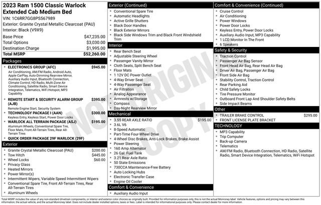 Get ready to hit the road in this Ram 1500 Classic, a standout choice for drivers looking for reliability, performance, and style! This impressive vehicle is packed with premium features designed to make every drive more enjoyable. Plus, youâll enjoy a $1,000 finance savings, already included in the sale price, when you finance through one of our trusted lending partners. Whether youâre searching for used cars in Salt Lake City, a dependable SUV, or a powerful truck, this Ram 1500 Classic delivers everything you need and more. Visit Salt Lake Valley Chrysler Dodge Jeep Ram today to test drive or explore our entire selection of quality pre-owned vehicles. Donât wait - shop online at www.slvcdjr.com or call 801-484-8755 to learn more! This amazing vehicle comes loaded with options like Electronics Group (4G LTE Wi-Fi Hot Spot, 8.4" Touchscreen Display, Air Conditioning ATC w/Dual Zone Control, Apple CarPlay, Audio Input Jack for Mobile Devices, Auto-Dimming Rear-View Mirror, Cluster 7.0" TFT Color Display, Google Android Auto, GPS Antenna Input, Humidity Sensor, Integrated Center Stack Radio, Integrated Voice Command w/Bluetooth, Media Hub (2 USB, AUX), Radio: Uconnect 5 w/8.4" Display, Remote USB Port, and USB Host Flip), Quick Order Package 29F Warlock (4x4 Flat Black Badge, B-Pillar Black Out, Bi-Function Halogen Projector Headlamps, Black Exterior Truck Badging, Black Grille w/RAM Lettering, Black Headlamp Filler Panel, Black Powder Coated Front Bumper, Black Powder Coated Rear Bumper, Black RAM Head Tailgate Badge, Black Wheel Flares, Front Wheel Well Liners, ParkSense Rear Park Assist System, Raised Ride Height, Rear Extra HD Shock Absorbers, Semi-Gloss Black Hub, Sport Tail Lamps, Warlock, Warlock Interior Accents, and Wheels: 20" x 9" High Gloss Black Aluminum), Remote Start & Security Alarm Group (Remote Start System and Security Alarm), SiriusXM Guardian - Included Trial (B) (1 Year Trial (Registration Required), For Details Visit DriveUconnect.com, and Global Telematics Box Module (TBM)), Technology Package I (2-Door Passive Entry, Front Door Locks, Gloss Black Door Handles, and Pushbutton Start), Warlock All Terrain Package (Center Hub, MOPAR Front & Rear Rubber Floor Mats, and Wheels: 17" x 8" Matte Black Aluminum), 17" x 7" Aluminum Wheels, 4-Wheel Disc Brakes, 40/20/40 Split Bench Seat, 6 Speakers, ABS brakes, Active Grille Shutters, Air Conditioning, Alloy wheels, AM/FM radio: SiriusXM, Black Exterior Mirrors, Brake assist, Bumpers: chrome, Charge Only Remote USB Port, Class IV Receiver Hitch, Cloth 40/20/40 Bench Seat, Compass, Delay-off headlights, Driver door bin, Dual front impact airbags, Dual front side impact airbags, Electronic Shift, Electronic Stability Control, Exterior Mirrors w/Heating Element, Front anti-roll bar, Front Armrest w/3 Cupholders, Front Center Armrest w/Storage, Front License Plate Bracket, Front reading lights, Front wheel independent suspension, Fully automatic headlights, Heated door mirrors, Illuminated entry, Low tire pressure warning, Occupant sensing airbag, Outside temperature display, Overhead airbag, Overhead console, Panic alarm, ParkView Rear Back-Up Camera, Passenger door bin, Passenger vanity mirror, Power door mirrors, Power steering, Power windows, Radio data system, Radio: Uconnect 3 w/5" Display, Rear anti-roll bar, Rear step bumper, Remote keyless entry, Rotary Shifter-Black, Speed control, Tachometer, Tilt steering wheel, Tip Start, Traction control, Trailer Brake Control, Trip computer, Variably intermittent wipers, and Voltmeter, making it the perfect choice for your next adventure. Ram Details: