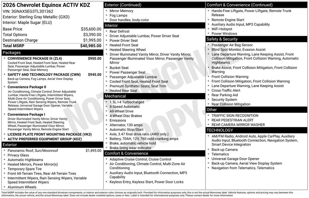 Experience the new Chevrolet Equinox, available now at Sky Chevrolet of Provo! With bold design, advanced technology, and dependable performance, Chevrolet makes every mile more exciting. From Utah Valleyâs city streets to mountain canyon drives, the Equinox is built to handle it all with confidence. Call 801-356-4300 today to schedule your test drive and see what makes it stand out! Sterling Gray Metallic 2026 Chevrolet Equinox ACTIV AWD 8-Speed Automatic 1.5L DOHC AWD.