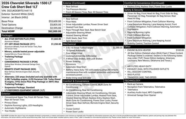 Discover the new Chevrolet Silverado 1500 at Salt Lake Valley Chevrolet in Salt Lake City! With bold design, modern technology, and reliable performance, Chevrolet makes every drive exciting. Whether itâs city streets or canyon roads, the Silverado 1500 is ready for anything. Call us today at 801-969-8221 to schedule a time to see it! --- 2026 Chevrolet Silverado 1500 Summit White 3.0L I6 --- Final price excludes tax, tag, title, documentation fees, dealer-installed options, and any market-based pricing adjustments. Financing through GM Financial is required for all discounts to apply. Special finance offers may not be combined with certain factory incentives. While we strive for accuracy, errors may occur please verify all information with a sales representative. For the most accurate pricing, call (801) 969-8221 or visit us in person. Prices and payments are subject to change based on manufacturer incentives. - Price includes - $1000 - Chevrolet Trade Assistance Bonus Cash Program $1750 - GM Bonus Cash $2500 - Chevrolet Consumer Cash Program - Price includes $1,000 Down Payment Assistance. Must Finance with GM Financial - Price includes $1,500 trade in allowance program for customers that own a 2018 or newer passenger car or truck with less than 80,000 miles and trade in their vehicle towards the purchase of a new 2024-2025 Chevrolet. Some restrictions may apply. Contact dealer for details