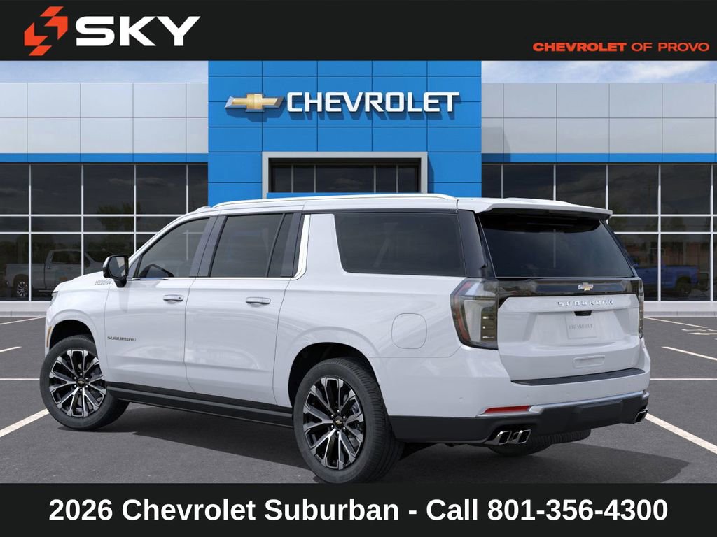 Experience the new Chevrolet Suburban, available now at Sky Chevrolet of Provo! With bold design, advanced technology, and dependable performance, Chevrolet makes every mile more exciting. From Utah Valleyâs city streets to mountain canyon drives, the Suburban is built to handle it all with confidence. Call 801-356-4300 today to schedule your test drive and see what makes it stand out! Polar White Tricoat 2026 Chevrolet Suburban High Country 4WD 10-Speed Automatic with Overdrive EcoTec3 6.2L V8 $1,000 Down Payment Assistance. Must Finance with GM Financial. $1,500 trade in allowance program for customers that own a 2018 or newer passenger car or truck with less than 80,000 miles and trade in their vehicle towards the purchase of a new 2025-2026 New Chevrolet. Some restrictions may apply. Contact dealer for details.