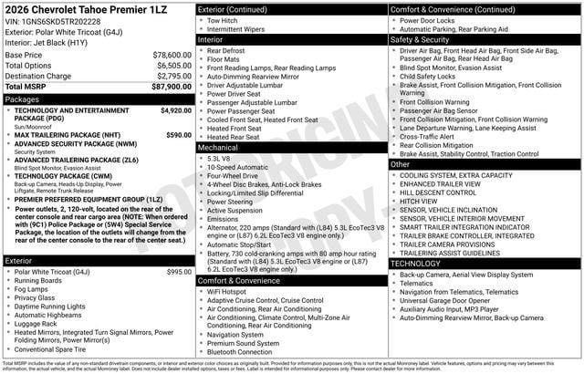 Discover the new Chevrolet Tahoe at Salt Lake Valley Chevrolet in Salt Lake City! With bold design, modern technology, and reliable performance, Chevrolet makes every drive exciting. Whether itâs city streets or canyon roads, the Tahoe is ready for anything. Call us today at 801-969-8221 to schedule a time to see it! --- 2026 Chevrolet Tahoe Polar White Tricoat EcoTec3 5.3L V8 --- Final price excludes tax, tag, title, documentation fees, dealer-installed options, and any market-based pricing adjustments. Financing through GM Financial is required for all discounts to apply. Special finance offers may not be combined with certain factory incentives. While we strive for accuracy, errors may occur please verify all information with a sales representative. For the most accurate pricing, call (801) 969-8221 or visit us in person. Prices and payments are subject to change based on manufacturer incentives.