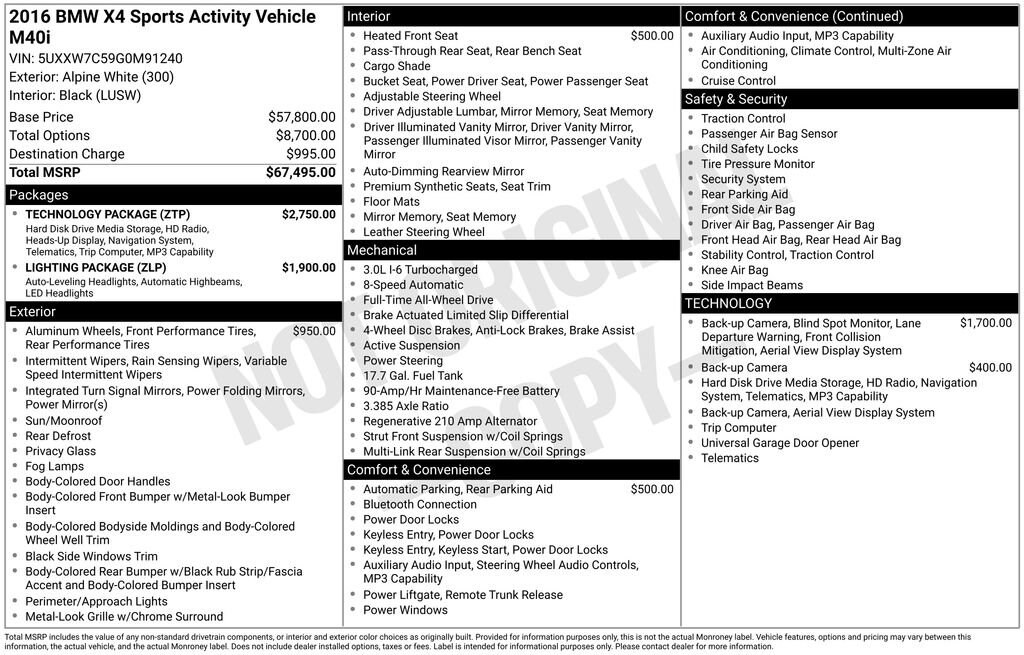 Alpine White 2016 BMW X4 M40i AWD 8-Speed Automatic Sport 3.0L I6 Turbocharged DOHC 24V ULEV II 355hpRecent Arrival!Reviews:* Powerful and fuel-efficient engines; comfortable ride; solid construction. Source: EdmundsCheck out our 5 Star Google Reviews! Drive a little save a lot. Sale Price Includes $1,000 Finance Savings. Contact Dealer For Details.