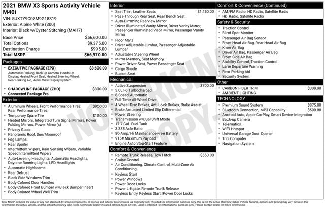Get ready to hit the road in this BMW X3, a standout choice for drivers looking for reliability, performance, and style! This impressive vehicle is packed with premium features designed to make every drive more enjoyable. Plus, youâll enjoy a $1,000 finance savings, already included in the sale price, when you finance through one of our trusted lending partners. Whether youâre searching for used cars in Salt Lake City, a dependable SUV, or a powerful truck, this BMW X3 delivers everything you need and more. Visit Salt Lake Valley Chrysler Dodge Jeep Ram today to test drive or explore our entire selection of quality pre-owned vehicles. Donât wait - shop online at www.slvcdjr.com or call 801-484-8755 to learn more! This amazing vehicle comes loaded with options like Connected Package Pro, Executive Package (Active Park Distance Control, Ambient Lighting, Gesture Control, Head-Up Display, Heated Front Seats, Heated Steering Wheel, Parking Assistant Plus, Rear-View Camera, Surround View w/3D View, and Vernasca Leather Upholstery), Shadowline Package (Extended Shadowline Trim), Wireless Charging (DISC) (Enhanced USB & Bluetooth (DISC)), 12 Speakers, 3.385 Axle Ratio, 4-Wheel Disc Brakes, ABS brakes, Adaptive M Suspension, Air Conditioning, Alloy wheels, AM/FM radio: SiriusXM with 360L, Apple CarPlay & Android Auto Compatibility, Auto High-beam Headlights, Auto-dimming door mirrors, Auto-dimming Rear-View mirror, Automatic temperature control, BMW Assist eCall, BMW TeleServices, Brake assist, Bumpers: body-color, Carbon Fiber Trim, ConnectedDrive Services, Delay-off headlights, Driver door bin, Driver vanity mirror, Dual front impact airbags, Dual front side impact airbags, Electronic Stability Control, Emergency communication system: BMW Assist eCall, Exterior Parking Camera Rear, Four wheel independent suspension, Front anti-roll bar, Front Bucket Seats, Front Center Armrest, Front dual zone A/C, Front fog lights, Front reading lights, Fully automatic headlights, Garage door transmitter, harman/kardon Surround Sound System, Heated door mirrors, Hi-Fi Sound System, Illuminated entry, Increased Top Speed Limiter, Knee airbag, Live Cockpit Pro w/Navigation, Low tire pressure warning, Lumbar Support, Memory seat, Navigation System, Occupant sensing airbag, Outside temperature display, Overhead airbag, Panic alarm, Passenger door bin, Passenger vanity mirror, Power door mirrors, Power driver seat, Power Front Seats, Power Liftgate, Power moonroof, Power passenger seat, Power steering, Power windows, Radio Control US, Radio data system, Radio: AM/FM Stereo w/HD, Rain sensing wipers, Rear air conditioning, Rear anti-roll bar, Rear reading lights, Rear seat center armrest, Rear window defroster, Rear window wiper, Remote keyless entry, Roof rack: rails only, Security system, SensaTec Upholstery, SiriusXM Satellite Radio, SiriusXM w/360L, Speed control, Speed-sensing steering, Speed-Sensitive Wipers, Split folding rear seat, Spoiler, Sport Bucket Seats, Sport steering wheel, Steering wheel mounted audio controls, Tachometer, Telescoping steering wheel, Tilt steering wheel, Traction control, Trailer Hitch, Trip computer, Turn signal indicator mirrors, Variably intermittent wipers, Wheels: 19" x 7.5" M Double-Spoke (Style 698M), Wheels: 20" x 8.0" Fr/20" x 9.5" Rr (Style 699M), and WiFi Hotspot, making it the perfect choice for your next adventure.