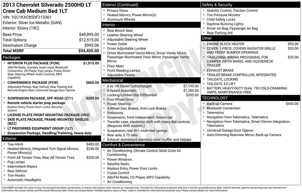 Silver Ice Metallic 2013 Chevrolet Silverado 2500HD LT 4WD Allison 1000 6-Speed Automatic Duramax 6.6L V8 Turbodiesel Allison 1000 6-Speed Automatic, 4WD, Ebony Cloth.Recent Arrival! Odometer is 8772 miles below market average!Reviews:* Impressive hauling and towing capabilities; refined and quiet ride; solid build quality; responsive steering. Source: Edmunds* If youâve been a longtime Chevy Silverado HD fan and itâs time to trade in your old rig, the features in the 2013 model should help you remain loyal. For those looking to potentially save fuel costs, the compressed natural gas option may make the Silverado 2500 HD more tempting. Source: KBB.comCheck out our 5 Star Google Reviews! Drive a little save a lot. Sale Price Includes $1,000 Finance Savings. Contact Dealer For Details.
