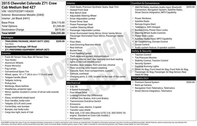 Turn every drive into something special with this Chevrolet Colorado from Salt Lake Valley Chevrolet! Designed for comfort, performance, and style, this vehicle comes fully equipped with modern technology and convenience features youâll love. Plus, enjoy a $1,000 finance savings, already included in the sale price, when you finance through one of our trusted lending partners. If youâre shopping for used cars in Salt Lake City, or searching for the perfect SUV, truck, or sedan, this Chevrolet Colorado delivers the dependability and value youâre looking for. Itâs the ideal match for your lifestyle - ready for everything from mountain adventures to city commutes. Visit Salt Lake Valley Chevrolet today and see why so many Utah drivers trust us for great deals on quality pre-owned vehicles. Explore our inventory online at www.slvchevy.com or call 801-969-8221 to schedule your test drive today! This impressive vehicle includes Heavy-Duty Trailering Package, Preferred Equipment Group 4Z7 (Transfer Case Shield), 3.42 Rear Axle Ratio, 4-Way Power Front Passenger Seat Adjuster, 4-Wheel Disc Brakes, 6 Speakers, 6-Speaker Audio System Feature, ABS brakes, Air Conditioning, Alloy wheels, AM/FM radio: SiriusXM, Auto-dimming Rear-View mirror, Automatic temperature control, Bose Premium 7-Speaker Audio System Feature, Bumpers: body-color, Cloth/Leatherette Seat Trim, Compass, Delay-off headlights, Driver 4-Way Power Seat Adjuster, Driver door bin, Driver vanity mirror, Dual front impact airbags, Dual front side impact airbags, Electronic Stability Control, Emergency communication system: OnStar Directions & Connections, Exterior Parking Camera Rear, Front anti-roll bar, Front Bucket Seats, Front Center Armrest, Front fog lights, Front reading lights, Front wheel independent suspension, Fully automatic headlights, Heated Driver & Front Passenger Seats, Heated front seats, Illuminated entry, Low tire pressure warning, Occupant sensing airbag, Outside temperature display, Overhead airbag, Overhead console, Panic alarm, Passenger door bin, Passenger vanity mirror, Power door mirrors, Power Driver Lumbar Control Seat Adjuster, Power driver seat, Power Passenger Lumbar Control Seat Adjuster, Power passenger seat, Power steering, Power windows, Premium audio system: Chevrolet MyLink, Radio data system, Radio: AM/FM/SiriusXM w/Chevrolet MyLink, Radio: AM/FM/SiriusXM w/Chevrolet MyLink & Nav, Rear reading lights, Rear seat center armrest, Rear step bumper, Rear window defroster, Remote keyless entry, Security system, SiriusXM Satellite Radio, Speed control, Speed-sensing steering, Steering wheel mounted audio controls, Tachometer, Telescoping steering wheel, Tilt steering wheel, Tow/Haul Mode, Traction control, Trip computer, Variably intermittent wipers, and Wheels: 17 x 8 Dark Argent Metallic Cast Alloy, offering everything you need for your next adventure.Clean CARFAX.Awards:* 2015 KBB.com Best Resale Value Awards * 2015 KBB.com Best Buy Awards Finalist