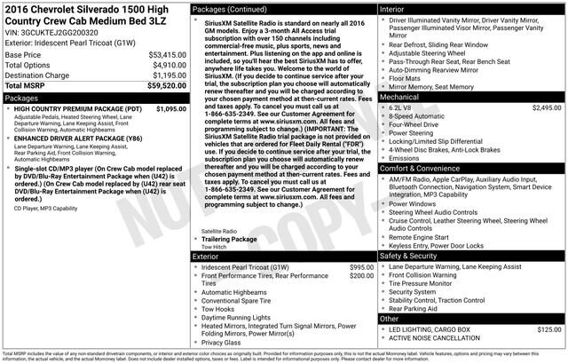 Turn every drive into something special with this Chevrolet Silverado 1500 from Salt Lake Valley Chevrolet! Designed for comfort, performance, and style, this vehicle comes fully equipped with modern technology and convenience features youâll love. Plus, enjoy a $1,000 finance savings, already included in the sale price, when you finance through one of our trusted lending partners. If youâre shopping for used cars in Salt Lake City, or searching for the perfect SUV, truck, or sedan, this Chevrolet Silverado 1500 delivers the dependability and value youâre looking for. Itâs the ideal match for your lifestyle - ready for everything from mountain adventures to city commutes. Visit Salt Lake Valley Chevrolet today and see why so many Utah drivers trust us for great deals on quality pre-owned vehicles. Explore our inventory online at www.slvchevy.com or call 801-969-8221 to schedule your test drive today! This impressive vehicle includes Enhanced Driver Alert Package (Forward Collision Alert, IntelliBeam Automatic High Beam On/Off Headlight, and Lane Keep Assist), High Country Premium Package (Integrated Trailer Brake Controller, Leather Wrapped Heated Steering Wheel, and Power Adjustable Pedals), Preferred Equipment Group 3LZ (110-Volt AC Power Outlet, 150 Amp Alternator, 4.2 Diagonal Color Display Driver Info Center, Auto-Dimming Inside Rear-View Mirror, Auxiliary External Transmission Oil Cooler, Bluetooth® For Phone, Chrome Bodyside Moldings, Chrome Cap Power-Adjustable Heated Outside Mirrors, Chrome Door Handles, Chrome Grille Surround, Chrome Mirror Caps, Color-Keyed Carpeting w/Rubberized Vinyl Floor Mats, Deep-Tinted Glass, Driver & Front Passenger Illuminated Vanity Mirrors, Dual-Zone Automatic Climate Control, Electric Rear-Window Defogger, EZ Lift & Lower Tailgate, HD Radio, Heavy-Duty Rear Locking Differential, Leather Wrapped Steering Wheel w/Cruise Controls, LED Taillamps w/Signature, Manual Tilt/Telescoping Steering Column, OnStar 6 Months Guidance Plan, OnStar w/4G LTE, Power Sliding Rear Window, Power Windows w/Driver Express Up, Rear 60/40 Folding Bench Seat (Folds Up), Rear Vision Camera w/Dynamic Guide Lines, Rear Wheelhouse Liners, Remote Keyless Entry, Remote Locking Tailgate, Remote Vehicle Starter System, Single Slot CD/MP3 Player, Spray-On Pickup Box Bed Liner, Steering Wheel Audio Controls, Theft Deterrent System (Unauthorized Entry), Thin Profile LED Fog Lamps, and Universal Home Remote), Trailering Package, 4 Movable Upper Cargo Tie Downs, 4-Wheel Disc Brakes, 6 Rectangular Chromed Tubular Assist Steps, 7 Speakers, ABS brakes, Active Noise Cancellation, Air Conditioning, Alloy wheels, AM/FM radio: SiriusXM, Auto-dimming door mirrors, Auto-dimming Rear-View mirror, Automatic temperature control, Body Color Rear Bumper w/Cornersteps, Bodyside moldings, Bose Speaker System, Brake assist, Bumpers: body-color, CD player, Chrome wheels, Color-Keyed Carpeted Floor Mats, Compass, Delay-off headlights, Driver door bin, Driver vanity mirror, Dual front impact airbags, Dual front side impact airbags, Electronic Stability Control, Emergency communication system: OnStar Guidance, Exterior Parking Camera Rear, Floor Mounted Console, Front anti-roll bar, Front Body-Color Bumper, Front Bucket Seats, Front Center Armrest w/Storage, Front dual zone A/C, Front fog lights, Front Frame-Mounted Black Recovery Hooks, Front Full Feature Power Reclining Bucket Seats, Front License Plate Kit, Front reading lights, Front wheel independent suspension, Fully automatic headlights, Garage door transmitter, Heated & Vented Front Seating, Heated door mirrors, Heated front seats, Heavy Duty Suspension, Illuminated entry, LED Cargo Box Lighting, Low tire pressure warning, Memory seat, Navigation System, Occupant sensing airbag, Outside temperature display, Overhead airbag, Overhead console, Panic alarm, Passenger door bin, Passenger vanity mirror, Perforated Leather Appointed Seat Trim, Polished Exhaust Tip, Power door mirrors,