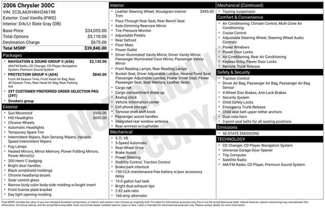 Turn every drive into something special with this Chrysler 300C from Salt Lake Valley Chevrolet! Designed for comfort, performance, and style, this vehicle comes fully equipped with modern technology and convenience features youâll love. Plus, enjoy a $1,000 finance savings, already included in the sale price, when you finance through one of our trusted lending partners. If youâre shopping for used cars in Salt Lake City, or searching for the perfect SUV, truck, or sedan, this Chrysler 300C delivers the dependability and value youâre looking for. Itâs the ideal match for your lifestyle - ready for everything from mountain adventures to city commutes. Visit Salt Lake Valley Chevrolet today and see why so many Utah drivers trust us for great deals on quality pre-owned vehicles. Explore our inventory online at www.slvchevy.com or call 801-969-8221 to schedule your test drive today! This impressive vehicle includes Navigation & Sound Group II (368 Watt Amplifier, 6CD/Full Map GPS Display Navigation, 7 Boston Acoustic Speakers w/Subwoofer, and Navigation System w/GPS), Protection Group II (Air Filtering, ParkSense Rear Park Assist System, and Supplemental Side Curtain Front/Rear Airbags), Quick Order Package 29T, 18 x 7.5 Chrome Clad Aluminum Wheels, 4-Wheel Disc Brakes, 6 Speakers, ABS brakes, Adjustable pedals, Air Conditioning, Alloy wheels, AM/FM Compact Disc w/Changer Control, AM/FM radio: SIRIUS, Audio memory, Auto tilt-away steering wheel, Auto-dimming door mirrors, Auto-dimming Rear-View mirror, Automatic temperature control, Bodyside moldings, Boston Acoustic Badge, Brake assist, Bumpers: body-color, CD player, Compass, Delay-off headlights, Driver door bin, Driver vanity mirror, Dual front impact airbags, Electronic Stability Control, Four wheel independent suspension, Front anti-roll bar, Front Bucket Seats, Front Center Armrest, Front dual zone A/C, Front fog lights, Front reading lights, Fully automatic headlights, Garage door transmitter: Homelink, Genuine California Walnut Wood Trim, Headlamp Washer, Heated door mirrors, Heated front seats, High-Intensity Discharge Headlamps, Illuminated entry, Leather steering wheel, Low tire pressure warning, Luxury Leather Trimmed Bucket Seats, Memory seat, Occupant sensing airbag, Outside temperature display, Overhead console, Panic alarm, Passenger door bin, Passenger vanity mirror, Pedal memory, Power door mirrors, Power driver seat, Power passenger seat, Power steering, Power Sunroof, Power windows, Rain sensing wipers, Rear anti-roll bar, Rear reading lights, Rear seat center armrest, Rear window defroster, Remote keyless entry, Security system, Speed control, Split folding rear seat, Steering wheel memory, Steering wheel mounted audio controls, Tachometer, Telescoping steering wheel, Tilt steering wheel, Traction control, Trip computer, Variably intermittent wipers, Wood Shift Knob, and Wood/Leather Wrapped Steering Wheel, offering everything you need for your next adventure.Odometer is 75241 miles below market average!