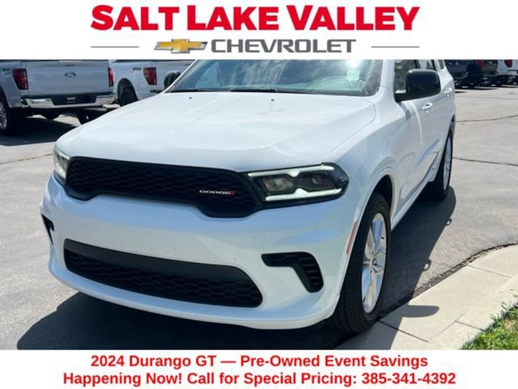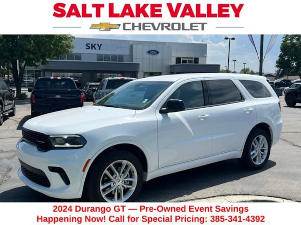Turn every drive into something special with this Dodge Durango from Salt Lake Valley Chevrolet! Designed for comfort, performance, and style, this vehicle comes fully equipped with modern technology and convenience features youâll love. Plus, enjoy a $1,000 finance savings, already included in the sale price, when you finance through one of our trusted lending partners. If youâre shopping for used cars in Salt Lake City, or searching for the perfect SUV, truck, or sedan, this Dodge Durango delivers the dependability and value youâre looking for. Itâs the ideal match for your lifestyle - ready for everything from mountain adventures to city commutes. Visit Salt Lake Valley Chevrolet today and see why so many Utah drivers trust us for great deals on quality pre-owned vehicles. Explore our inventory online at www.slvchevy.com or call 801-969-8221 to schedule your test drive today! This impressive vehicle includes Quick Order Package 2BD GT, 3.45 Rear Axle Ratio, 3rd row seats: split-bench, 4-Wheel Disc Brakes, 6 Speakers, ABS brakes, Air Conditioning, Alloy wheels, AM/FM radio: SiriusXM, Apple CarPlay, Apple CarPlay/Android Auto, Auto-dimming Rear-View mirror, Automatic temperature control, Brake assist, Bumpers: body-color, Cloth Bucket Seats w/Shift Insert, Compass, Delay-off headlights, Driver door bin, Driver vanity mirror, Dual front impact airbags, Dual front side impact airbags, Electronic Stability Control, Exterior Mirrors w/Heating Element, Four wheel independent suspension, Front anti-roll bar, Front Bucket Seats, Front Center Armrest w/Storage, Front dual zone A/C, Front License Plate Bracket, Front reading lights, Fully automatic headlights, Garage door transmitter, Gloss Black Exterior Mirrors, Google Android Auto, GPS Antenna Input, Heated door mirrors, Heated front seats, Heated steering wheel, Illuminated entry, Integrated Center Stack Radio, Integrated Voice Command w/Bluetooth, Knee airbag, Leather steering wheel, Low tire pressure warning, Occupant sensing airbag, Outside temperature display, Overhead airbag, Overhead console, Panic alarm, ParkView Rear Back-Up Camera, Passenger door bin, Passenger vanity mirror, Power door mirrors, Power driver seat, Power Liftgate, Power steering, Power windows, Radio data system, Radio: Uconnect 4 w/8.4 Display, Rear air conditioning, Rear anti-roll bar, Rear reading lights, Rear seat center armrest, Rear window defroster, Rear window wiper, Red Accent Stitching, Remote keyless entry, Speed control, Speed-sensing steering, Speed-Sensitive Wipers, Split folding rear seat, Spoiler, Sport steering wheel, Steering wheel mounted audio controls, Tachometer, Telescoping steering wheel, Tilt steering wheel, Traction control, Trip computer, USB Host Flip, Variably intermittent wipers, Voltmeter, and Wheels: 20 x 8.0 Fine Silver, offering everything you need for your next adventure.Odometer is 3308 miles below market average!Clean CARFAX.