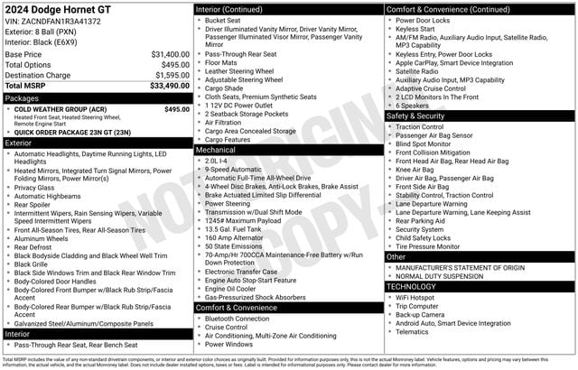 Get ready to hit the road in this Dodge Hornet, a standout choice for drivers looking for reliability, performance, and style! This impressive vehicle is packed with premium features designed to make every drive more enjoyable. Plus, youâll enjoy a $1,000 finance savings, already included in the sale price, when you finance through one of our trusted lending partners. Whether youâre searching for used cars in Salt Lake City, a dependable SUV, or a powerful truck, this Dodge Hornet delivers everything you need and more. Visit Salt Lake Valley Chrysler Dodge Jeep Ram today to test drive or explore our entire selection of quality pre-owned vehicles. Donât wait - shop online at www.slvcdjr.com or call 801-484-8755 to learn more! This amazing vehicle comes loaded with options like Cold Weather Group (Heated Front Seats, Heated Steering Wheel, and Remote Start System), Quick Order Package 23N GT, 10.25" Touchscreen Display, 4-Wheel Disc Brakes, 6 Speakers, ABS brakes, Air Conditioning, Alloy wheels, AM/FM radio: SiriusXM, Anti-whiplash front head restraints, Apple CarPlay, Apple CarPlay/Android Auto, Auto High-beam Headlights, Brake assist, Bumpers: body-color, Cloth/Leatherette Seats, Compass, Connectivity - US/Canada, Delay-off headlights, Disassociated Touchscreen Display, Driver door bin, Driver vanity mirror, Dual front impact airbags, Dual front side impact airbags, Electronic Stability Control, Emergency communication system: Dodge Connect, Four wheel independent suspension, Front anti-roll bar, Front Bucket Seats, Front Center Armrest w/Storage, Front dual zone A/C, Front reading lights, Fully automatic headlights, Google Android Auto, GPS Antenna Input, Heated door mirrors, Illuminated entry, Integrated Center Stack Radio, Knee airbag, Lane Departure Warning System, Leather steering wheel, Low tire pressure warning, Manual Adjust 6-Way Driver Seat, Manual Adjust 6-Way Front Passenger Seat, Manufacturer's Statement of Origin, Normal Duty Suspension, Occupant sensing airbag, Outside temperature display, Overhead airbag, Overhead console, Panic alarm, ParkView Rear Back-Up Camera, Passenger door bin, Passenger vanity mirror, Power door mirrors, Power steering, Power windows, Radio: Uconnect 5 w/10.25" Display, Rain sensing wipers, Rear anti-roll bar, Rear seat center armrest, Rear window defroster, Rear window wiper, Remote keyless entry, Security system, Speed control, Speed-sensing steering, Split folding rear seat, Spoiler, Tachometer, TBD Axle Ratio, Telescoping steering wheel, Tilt steering wheel, Traction control, Trip computer, Turn signal indicator mirrors, Variably intermittent wipers, and Wheels: 17" x 7" Silver Aluminum, making it the perfect choice for your next adventure. Priced below KBB Fair Purchase Price!