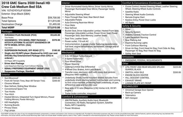 Take your drives to the next level with this GMC Sierra 3500HD from Salt Lake Valley Buick GMC! Engineered for a smooth ride, advanced convenience, and lasting dependability, this vehicle is ready to handle everything your day throws at you. Plus, enjoy a $1,000 finance savings, already included in the sale price, when you finance through one of our trusted lending partners. Looking for quality used cars in Salt Lake City? This GMC Sierra 3500HD delivers style, versatility, and value - perfect for daily commutes, family trips, or weekend adventures. Stop by Salt Lake Valley Buick GMC to see this vehicle in person and explore our wide selection of pre-owned cars, trucks, and SUVs. Browse online at www.slvbuickgmc.com or call 801-265-1511 to schedule your test drive today! With Driver Alert Package (Forward Collision Alert and Lane Departure Warning System), Duramax Plus Package (Chrome Recovery Hooks), Gooseneck/5th Wheel Prep Package, Off-Road Suspension Package (Hill Descent Control), Preferred Equipment Group 5SA (110-Volt AC Power Outlet, 150 Amps Alternator, 8 Multi-Color Customizable Driver Display, Auto-Dimming Inside Rear-View Mirror, Chrome Bodyside Moldings, Chrome Door Handles, Chrome Power-Adjustable Heated Outside Mirrors, Color-Keyed Carpeted 1st & 2nd Row Floor Mats, Color-Keyed Carpeting Floor Covering, Deep-Tinted Glass, Driver & Front Passenger Visors, Dual-Zone Automatic Climate Control, Electric Rear-Window Defogger, Electronic Shift Transfer Case, EZ-Lift & Lower Tailgate, Front Body-Color Bumper, Front Frame-Mounted Black Recovery Hooks, Front Halogen Fog Lamps, GMC 4G LTE, GMC Connected Access, HD Radio, Heated & Ventilated Front Seating, Leather Wrapped Heated Steering Wheel, Manual Tilt-Wheel/Telescoping Steering Column, OnStar & GMC Connected Services Capable, Power Adjustable Pedals, Power Sliding Rear Window w/Defogger, Power Windows, Rear 60/40 Folding Bench Seat (Folds Up), Rear Body-Color Bumper w/Bumper CornerSteps, Rear Vision Camera, Rear Wheelhouse Liners, Remote Keyless Entry, Remote Locking Tailgate, Remote Vehicle Starter System, Single-Slot CD/MP3 Player, Steering Wheel Audio Controls, Ultrasonic Front & Rear Park Assist, Unauthorized Entry Theft-Deterrent System, and Universal Home Remote), Standard Suspension Package, Trailering Equipment, 18 Chromed Aluminum Wheels, 4-Wheel Disc Brakes, 7 Speakers, ABS brakes, Adjustable pedals, Air Conditioning, Alloy wheels, AM/FM radio: SiriusXM, Apple CarPlay/Android Auto, Auto-dimming Rear-View mirror, Automatic temperature control, Black Front & Rear Molded Splash Guards (LPO), Bodyside moldings, Bose Speaker System, Brake assist, Bumpers: body-color, CD player, Chrome wheels, Compass, Delay-off headlights, Driver door bin, Driver vanity mirror, Dual front impact airbags, Dual front side impact airbags, Electronic Stability Control, Emergency communication system: OnStar Guidance, Engine Block Heater, Exhaust Brake, Exterior Parking Camera Rear, Floor Mounted Console, Front anti-roll bar, Front Bucket Seats, Front Center Armrest, Front dual zone A/C, Front fog lights, Front Full Feature Bucket Seats, Front License Plate Kit, Front reading lights, Front wheel independent suspension, Fully automatic headlights, Garage door transmitter, Heated door mirrors, Heated Driver & Front Passenger Seats, Heated front seats, Heated steering wheel, High Idle Switch, High-Intensity Discharge Headlights, Illuminated entry, Memory seat, Navigation System, Occupant sensing airbag, Outside temperature display, Overhead airbag, Overhead console, Panic alarm, Passenger door bin, Passenger vanity mirror, Pedal memory, Perforated Leather-Appointed Seat Trim, Power door mirrors, Power driver seat, Power passenger seat, Power steering, Power Sunroof, Power windows, Premium audio system: GMC Infotainment System, Radio: AM/FM/SiriusXM w/GMC Infotainment & Nav, Rear reading lights, Rear seat center armrest, Rear step bumper,