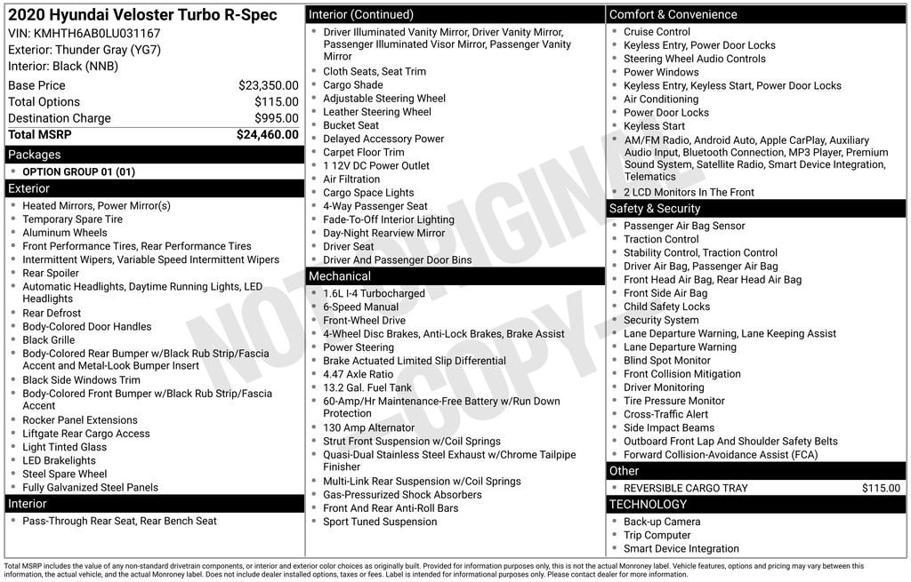 Thunder Gray 2020 Hyundai Veloster Turbo R-Spec FWD 6-Speed Manual 1.6L 4-Cylinder DGI DOHC
