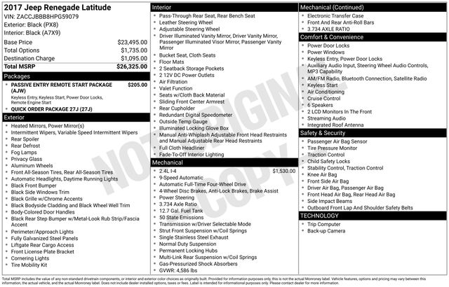 Get ready to hit the road in this Jeep Renegade, a standout choice for drivers looking for reliability, performance, and style! This impressive vehicle is packed with premium features designed to make every drive more enjoyable. Plus, youâll enjoy a $1,000 finance savings, already included in the sale price, when you finance through one of our trusted lending partners. Whether youâre searching for used cars in Salt Lake City, a dependable SUV, or a powerful truck, this Jeep Renegade delivers everything you need and more. Visit Salt Lake Valley Chrysler Dodge Jeep Ram today to test drive or explore our entire selection of quality pre-owned vehicles. Donât wait - shop online at www.slvcdjr.com or call 801-484-8755 to learn more! This amazing vehicle comes loaded with options like Passive Entry Remote Start Package (Passive Entry/Keyless Go), Quick Order Package 27J, 16" x 6.5" Aluminum Wheels, 17" x 7.0" Aluminum Wheels, 4-Wheel Disc Brakes, 6 Speakers, ABS brakes, Air Conditioning, Alloy wheels, AM/FM radio: SiriusXM, Anti-whiplash front head restraints, Brake assist, Cloth Low-Back Bucket Seats, Compass, Delay-off headlights, Driver door bin, Driver vanity mirror, Dual front impact airbags, Dual front side impact airbags, Electronic Stability Control, Four wheel independent suspension, Front anti-roll bar, Front Bucket Seats, Front Center Armrest, Front fog lights, Front reading lights, Fully automatic headlights, Heated door mirrors, Illuminated entry, Knee airbag, Leather steering wheel, Low tire pressure warning, Normal Duty Suspension, Occupant sensing airbag, Outside temperature display, Overhead airbag, Overhead console, Panic alarm, ParkView Rear Back-Up Camera, Passenger door bin, Passenger vanity mirror, Power door mirrors, Power steering, Power windows, Radio data system, Radio: Uconnect 3 w/5" Display, Rear anti-roll bar, Rear window defroster, Rear window wiper, Remote keyless entry, Roof rack: rails only, Speed control, Split folding rear seat, Spoiler, Steering wheel mounted audio controls, Tachometer, Telescoping steering wheel, Tilt steering wheel, Traction control, Trip computer, Variably intermittent wipers, and Voltmeter, making it the perfect choice for your next adventure. Priced below KBB Fair Purchase Price!