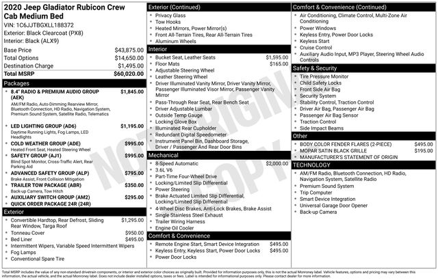 Get ready to hit the road in this Jeep Gladiator, a standout choice for drivers looking for reliability, performance, and style! This impressive vehicle is packed with premium features designed to make every drive more enjoyable. Plus, youâll enjoy a $1,000 finance savings, already included in the sale price, when you finance through one of our trusted lending partners. Whether youâre searching for used cars in Salt Lake City, a dependable SUV, or a powerful truck, this Jeep Gladiator delivers everything you need and more. Visit Salt Lake Valley Chrysler Dodge Jeep Ram today to test drive or explore our entire selection of quality pre-owned vehicles. Donât wait - shop online at www.slvcdjr.com or call 801-484-8755 to learn more! This amazing vehicle comes loaded with options like 8.4" Radio & Premium Audio Group (1-Year SiriusXM Guardian Trial, 5-Year SiriusXM Traffic Service, 5-Year SiriusXM Travel Link Service, Alpine Premium Audio System, Auto-Dimming Rear-View Mirror, Emergency/Assistance Call, For Details, Visit DriveUconnect.com, HD Radio, Radio: Uconnect 4C Nav w/8.4" Display, SiriusXM Traffic Plus, and SiriusXM Travel Link), Advanced Safety Group (Advanced Brake Assist and Full Speed Forward Collision Warning Plus), Auxiliary Switch Group (240 Amp Alternator, 700 Amp Maintenance Free Battery, and Auxiliary Switches), Cold Weather Group (Heated Front Seats and Heated Steering Wheel), LED Lighting Group (Daytime Running Lamps LED Accents, Front LED Fog Lamps, LED Park Turn Lamps, LED Reflector Headlamps, and LED Taillamps), Quick Order Package 24R, Safety Group (Blind Spot & Cross Path Detection and ParkSense Rear Park Assist System), Trailer Tow Package (Class IV Hitch Receiver, Heavy-Duty Engine Cooling, and Trailer Hitch Zoom), 4-Wheel Disc Brakes, 4.10 Rear Axle Ratio, 8 Speakers, 97 mph Maximum Speed Calibration, ABS brakes, Air Conditioning, All-Weather Slush Mats, Alloy wheels, AM/FM radio: SiriusXM, Apple CarPlay/Android Auto, Automatic temperature control, Black 3-Piece Hard Top, Body Color Fender Flares (2-Piece), Brake assist, Compass, Delay-off headlights, Driver door bin, Driver vanity mirror, Dual front impact airbags, Dual front side impact airbags, Electronic Stability Control, Freedom Panel Storage Bag, Front anti-roll bar, Front Bucket Seats, Front Center Armrest w/Storage, Front dual zone A/C, Front fog lights, Front reading lights, Fully automatic headlights, Garage door transmitter, Heated door mirrors, Illuminated entry, Integrated roll-over protection, Leather steering wheel, Low tire pressure warning, Manufacturer's Statement of Origin, MOPAR Hard Tri-Fold Tonneau Cover, MOPAR Satin Black Grille, No Soft Top, Occupant sensing airbag, Outside temperature display, Panic alarm, ParkView Rear Back-Up Camera, Passenger door bin, Passenger vanity mirror, Performance Suspension, Power door mirrors, Power steering, Power windows, Premium Cloth Low-Back Bucket Seats, Radio data system, Radio: Uconnect 4 w/7" Display, Rear anti-roll bar, Rear reading lights, Rear Sliding Window, Rear Window Defroster, Remote keyless entry, Remote Proximity Keyless Entry, Remote Start System, Security system, Speed control, Split folding rear seat, Spray In Bedliner, Steering wheel mounted audio controls, Tachometer, Telescoping steering wheel, Tilt steering wheel, Traction control, Trip computer, Variably intermittent wipers, Voltmeter, and Wheels: 17" x 7.5" Granite Crystal Aluminum, making it the perfect choice for your next adventure.