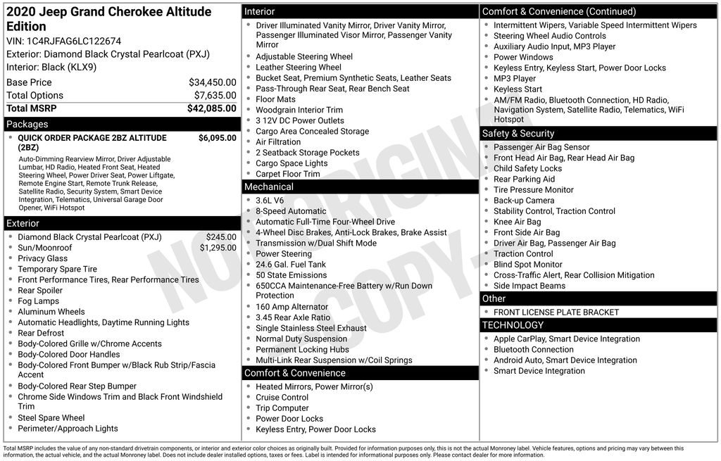 Diamond Black Crystal Pearlcoat 2020 Jeep Grand Cherokee Altitude 4WD 8-Speed Automatic 3.6L V6 24V VVT 4WD.