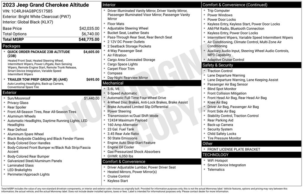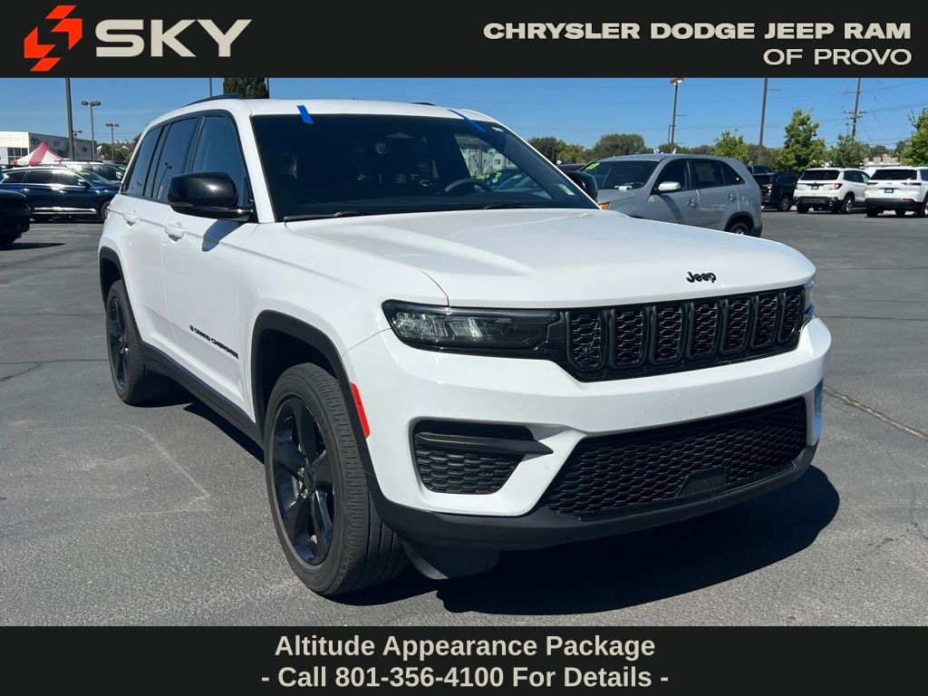 Bright White Clearcoat 2023 Jeep Grand Cherokee Altitude 4WD 8-Speed Automatic 3.6L V6 24V VVT New Tires, Serviced Here, Local Trade, 4WD, 115-Volt Auxiliary Power Outlet, Altitude Appearance Package, Black Headliner, Capri Leatherette Seats w/Suede, Delete Laredo Badge, Gloss Black Exterior Accents, Gloss Black Roof Rails, Power Liftgate, Quick Order Package 23B Altitude, Rain-Sensing Windshield Wipers, Remote Start System, Secondary Active Grille Shutters, Selectable Tire Fill Alert, Wheels: 20" x 8.0" Gloss Black Aluminum, Wireless Charging Pad.