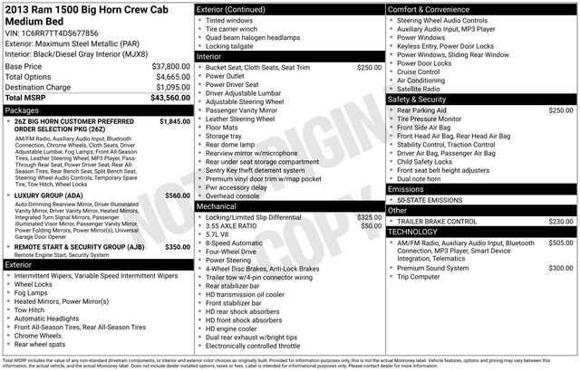 Take your drives to the next level with this Ram 1500 from Salt Lake Valley Buick GMC! Engineered for a smooth ride, advanced convenience, and lasting dependability, this vehicle is ready to handle everything your day throws at you. Plus, enjoy a $1,000 finance savings, already included in the sale price, when you finance through one of our trusted lending partners. Looking for quality used cars in Salt Lake City? This Ram 1500 delivers style, versatility, and value - perfect for daily commutes, family trips, or weekend adventures. Stop by Salt Lake Valley Buick GMC to see this vehicle in person and explore our wide selection of pre-owned cars, trucks, and SUVs. Browse online at www.slvbuickgmc.com or call 801-265-1511 to schedule your test drive today! With Big Horn Regional Package, Luxury Group (Ash Tray Lamp, Auto-Dimming Exterior Mirrors, Exterior Mirrors Courtesy Lamps, Exterior Mirrors w/Supplemental Signals, Glove Box Lamp, Overhead Console w/UGDO, Power Folding Mirrors, Power Heated Fold-Away Mirrors, Rear Dome w/On/Off Switch Lamp, Rear-View Auto-Dimming Mirror w/Microphone, Sun Visors w/Illuminated Vanity Mirrors, Underhood Lamp, and Universal Garage Door Opener), Quick Order Package 26Z Big Horn (115V Auxiliary Power Outlet, 20 x 8 Chrome Clad Aluminum Wheels, 40/20/40 Split Bench Seat, 5.0 Touch Screen Display, Bighorn Badge, Bright/Bright Billets Grille, Charge Only Remote USB Port, Class IV Receiver Hitch, Electroluminescent Instrument Cluster, Fog Lamps, Folding Flat Load Floor Storage, Front Armrest w/Three Cupholders, Front Center Seat Cushion Storage, GPS Antenna Input, Integrated Voice Command w/Bluetooth, Leather Wrapped Steering Wheel, Media Hub (USB, AUX), Power 10-Way Driver Seat, Power Lumbar Adjust, Premium Cloth 40/20/40 Bench Seat, Radio: Uconnect 5.0 AM/FM/BT, Rear 60/40 Split Folding Seat, Rear View Mirror w/Microphone, Steering Wheel Mounted Audio Controls, Storage Tray, and Uconnect Voice Command w/Bluetooth), Remote Start & Security Group (Remote Start System and Security Alarm), 17 x 7 Aluminum Wheels, 4-Wheel Disc Brakes, 6 Month Trial (Registration Required), 6 Speakers, 8.4 Touch Screen Display, 9 Amplified Speakers w/Subwoofer, ABS brakes, Air Conditioning, Alloy wheels, AM/FM radio: SiriusXM, Anti-Spin Differential Rear Axle, Black Exterior Mirrors, Brake assist, Bumpers: chrome, Center Hub, Cloth 40/20/40 Bench Seat, Compass, Delay-off headlights, Driver door bin, Dual front impact airbags, Dual front side impact airbags, Electronic Stability Control, Exterior Mirrors w/Heating Element, Front anti-roll bar, Front Center Armrest w/Storage, Front reading lights, Front wheel independent suspension, Fully automatic headlights, Heated door mirrors, Illuminated entry, Low tire pressure warning, Media Hub (SD, USB, AUX), Nav-Ready See Dealer for Details, Occupant sensing airbag, Outside temperature display, Overhead airbag, Overhead console, Panic alarm, ParkSense Rear Park Assist System, Passenger door bin, Passenger vanity mirror, Power door mirrors, Power steering, Power windows, Radio data system, Radio: Uconnect 3.0 AM/FM, Radio: Uconnect 8.4A AM/FM/BT/Access, Rear anti-roll bar, Rear seat center armrest, Rear step bumper, Remote keyless entry, Speed control, Tachometer, Tilt steering wheel, Traction control, Trailer Brake Control, Trip computer, Uconnect Access Advantage, Variably intermittent wipers, and Voltmeter designed for convenience and enjoyment, this Ram 1500 is ready to take you wherever you want to go.