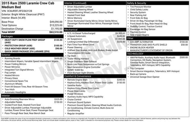 Turn every drive into something special with this Ram 2500 from Salt Lake Valley Chevrolet! Designed for comfort, performance, and style, this vehicle comes fully equipped with modern technology and convenience features youâll love. Plus, enjoy a $1,000 finance savings, already included in the sale price, when you finance through one of our trusted lending partners. If youâre shopping for used cars in Salt Lake City, or searching for the perfect SUV, truck, or sedan, this Ram 2500 delivers the dependability and value youâre looking for. Itâs the ideal match for your lifestyle - ready for everything from mountain adventures to city commutes. Visit Salt Lake Valley Chevrolet today and see why so many Utah drivers trust us for great deals on quality pre-owned vehicles. Explore our inventory online at www.slvchevy.com or call 801-969-8221 to schedule your test drive today! This impressive vehicle includes Cold Weather Group (Engine Block Heater and Winter Front Grille Cover), CTR Stop Lamp w/Cargo View Camera (Rear View Auto Dim Mirror w/Display), Heavy Duty Snow Plow Prep Group, Protection Group, Quick Order Package 2FH Laramie, 1 Year Trial (Registration Required), 10 Speakers, 115V Auxiliary Power Outlet, 220 Amp Alternator, 4-Wheel Disc Brakes, 5-Year SiriusXM Traffic Service, 5-Year SiriusXM Travel Link Service, 8.4 Touchscreen Display, ABS brakes, Air Conditioning, Alloy wheels, AM/FM radio: SiriusXM, Anti-Spin Differential Rear Axle, Audio memory, Auto Level Rear Air Suspension, Auto-dimming door mirrors, Auto-dimming Rear-View mirror, Automatic temperature control, Brake assist, Bumpers: chrome, Center Hub, Chrome Exterior Mirrors, Compass, Delay-off headlights, Driver door bin, Driver vanity mirror, Dual front impact airbags, Dual front side impact airbags, Electronic Stability Control, Electronically Controlled Throttle, Emergency communication system, Exterior Mirrors Courtesy Lamps, Exterior Mirrors w/Heating Element, Exterior Mirrors w/Memory, Exterior Mirrors w/Supplemental Signals, Folding Flat Load Floor Storage, Front anti-roll bar, Front Bumper Sight Shields, Front Center Armrest w/Storage, Front dual zone A/C, Front fog lights, Front reading lights, Fully automatic headlights, Garage door transmitter, GPS Antenna Input, GPS Navigation, Harman Radio Manufacturer, HD Radio, Heated door mirrors, Heated Front Seats, Heated front seats, Heated steering wheel, Hemi Badge, High Back Seats, Illuminated entry, Integrated Voice Command w/Bluetooth, Keyless Enter-N-Go, Leather steering wheel, Leather Trim 40/20/40 Bench Seat, Locking Tailgate, Low tire pressure warning, Manufacturer's Statement of Origin, Media Hub (SD, USB, AUX), Memory seat, Next Generation Engine Controller, Occupant sensing airbag, Outside temperature display, Overhead airbag, Overhead console, Panic alarm, ParkView Rear Back-Up Camera, Passenger door bin, Passenger vanity mirror, Power 10-Way Memory Driver & 6-Way Passenger Seats, Power Adjustable Pedals w/Memory, Power door mirrors, Power driver seat, Power Folding Mirrors, Power Lumbar Adjust, Power passenger seat, Power steering, Power windows, Radio data system, Radio: Uconnect 8.4A AM/FM/SXM/BT, Radio: Uconnect 8.4AN AM/FM/SXM/HD/BT/NAV, Rear 60/40 Split Folding Seat, Rear seat center armrest, Rear step bumper, Remote keyless entry, Remote Proximity Keyless Entry, Remote Start System, Security system, SiriusXM Satellite Radio, SiriusXM Traffic, SiriusXM Travel Link, Speed control, Split folding rear seat, Steering wheel mounted audio controls, Tachometer, Tilt steering wheel, Tip Start, Traction control, Transmission Oil Cooler, Trip computer, Turn signal indicator mirrors, Uconnect Access, Variably intermittent wipers, Vendor Painted Cargo Box Tracking, Ventilated Front Seats, Ventilated front seats, Voltmeter, Wheel to Wheel Side Steps, and Wheels: 18 x 8.0 Polished Aluminum, offering everything you need for your next adventure.
