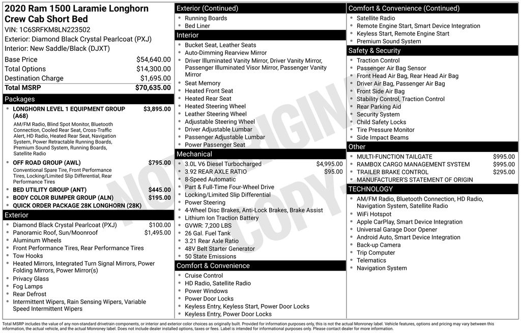 Check out our award winning dealership! 5-star google review, drive a little save a lot. Bed Utility Group, Body Color Bumper Group, Longhorn Level 1 Equipment Group (1-Yr SiriusXM Guardian Trial, 12" Touchscreen Display, 4G LTE Wi-Fi Hot Spot, 5-Year SiriusXM Travel Link Service, Apple CarPlay, Disassociated Touchscreen Display, For Details, Visit DriveUconnect.com, Google Android Auto, GPS Antenna Input, GPS Navigation, HD Radio, Integrated Center Stack Radio, No Satellite Coverage w/HI/AK/PR/VI/GU, Radio: Uconnect 12 w/Navigation, SiriusXM Satellite Radio, SiriusXM Traffic Plus, SiriusXM Travel Link, SiriusXM w/360L, and USB Host Flip), Off Road Group (E-Locker Rear Axle, Front Extra HD Shock Absorbers, Hill Descent Control, Off Road Decals, and Rear Extra HD Shock Absorbers), Quick Order Package 28K Longhorn, #1 Seat Foam Cushion, 10 Speakers, 3 Rear Seat Head Restraints, 4 Way Front Headrests, 4-Wheel Disc Brakes, 48V Belt Starter Generator, ABS brakes, Adjustable pedals, Air Conditioning, Alloy wheels, AM/FM radio: SiriusXM, Apple CarPlay/Android Auto, Audio memory, Auto High-beam Headlights, Auto-dimming door mirrors, Auto-dimming Rear-View mirror, Automatic temperature control, Brake assist, Bucket Seats, Bumpers: chrome, Compass, Delay-off headlights, Dome Dual LED Reading Lamp, Driver door bin, Driver Seat Memory, Driver vanity mirror, Dual front impact airbags, Dual front side impact airbags, Dual-Pane Panoramic Sunroof, Electronic Stability Control, Emergency communication system: SiriusXM Guardian, Front anti-roll bar, Front Bucket Seats, Front Center Armrest w/Storage, Front dual zone A/C, Front fog lights, Front reading lights, Front Seat Back Map Pockets, Front wheel independent suspension, Fully automatic headlights, Garage door transmitter, Genuine wood console insert, Genuine wood dashboard insert, Genuine wood door panel insert, Heated door mirrors, Heated Front Seats, Heated front seats, Heated rear seats, Heated Second Row Seats, Heated Steering Wheel, Heated steering wheel, Illuminated entry, Leather steering wheel, LED Dome/Reading Lamp, Low tire pressure warning, Manufacturer's Statement of Origin, Memory seat, Multi-Function Tailgate, Navigation System, Occupant sensing airbag, Outside temperature display, Overhead airbag, Overhead console, Panic alarm, ParkView Rear Back-Up Camera, Passenger door bin, Passenger vanity mirror, Pedal memory, Power 4-Way Driver Lumbar Adjust, Power 4-Way Passenger Lumbar Adjust, Power 8-Way Driver & Passenger Seats, Power door mirrors, Power driver seat, Power passenger seat, Power steering, Power windows, Premium Leather Seats w/Filigree, Radio data system, Radio: Uconnect 4C Nav w/8.4" Display, Rain sensing wipers, RamBox Cargo Management System, Rear 60/40 Folding Split Recline Seat, Rear anti-roll bar, Rear seat center armrest, Rear step bumper, Rear window defroster, Remote keyless entry, Security system, Speed control, Split folding rear seat, Steering wheel mounted audio controls, Tachometer, Telescoping steering wheel, Tilt steering wheel, Traction control, Trailer Brake Control, Trip computer, Turn signal indicator mirrors, Variably intermittent wipers, Ventilated Front Seats, Ventilated front seats, Voltmeter, and Wheels: 20" x 9" Aluminum Painted/Polished Sale Price Includes $1,000 Finance Savings. Contact Dealer For DetailS.