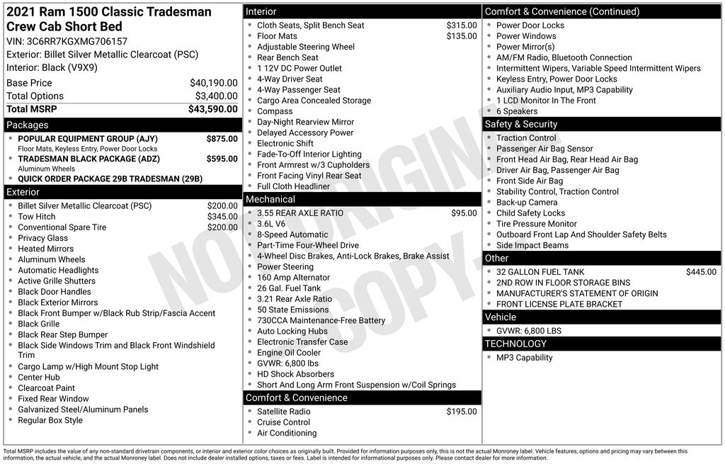 Billet Silver Metallic Clearcoat 2021 Ram 1500 Classic Tradesman 4WD 8-Speed Automatic 3.6L V6 24V VVT New Tires, Local Trade, 1-Yr SiriusXM Guardian Trial, 4x4 Flat Black Badge, 8.4" Touchscreen Display, Air Conditioning ATC w/Dual Zone Control, Apple CarPlay, Black Exterior Truck Badging, Black Headlamp Bezels, Black Painted Honeycomb Grille, Black Ram 1500 Express Group, Black RAM Tailgate Nameplate, Cluster 7.0" TFT Color Display, For More Info, Call 800-643-2112, Google Android Auto, HD Radio, Humidity Sensor, Media Hub (2 USB, AUX), No Satellite Coverage w/HI/AK/PR/VI/GU, Radio: Uconnect 4C w/8.4" Display, SiriusXM Radio Service, SiriusXM Satellite Radio, USB Host Flip.
