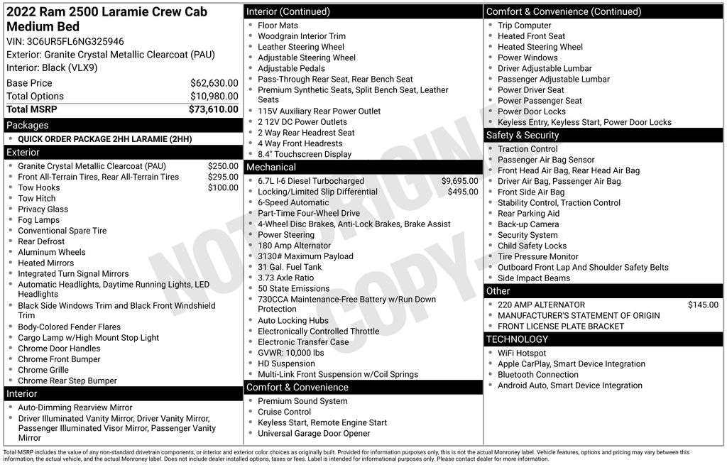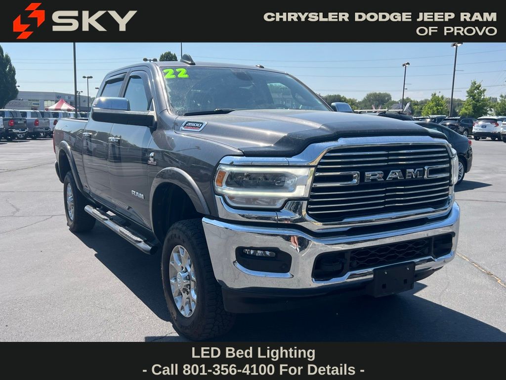 Granite Crystal Metallic Clearcoat 2022 Ram 2500 Laramie 4WD 6-Speed Automatic Cummins 6.7L I6 Turbodiesel New Tires, Local Trade, Bed Utility Group, LED Bed Lighting, MOPAR Deployable Bed Step, MOPAR Spray In Bedliner, Navigation System.