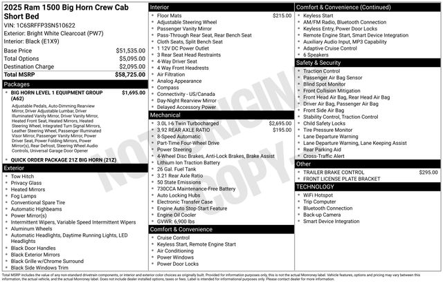 This 2025 Ram 1500 Big Horn is a versatile full-size pickup that combines capability, comfort, and modern technology, making it perfect for work, recreation, and everyday driving. Powered by a responsive engine, it delivers smooth acceleration, confident handling, and excellent towing and hauling performance. The exterior showcases bold Ram styling with a prominent grille, durable bed, and premium wheels that stand out on the road. Inside, the cabin is spacious and well-appointed, featuring a touchscreen infotainment system, Bluetooth connectivity, Apple CarPlay and Android Auto integration, and comfortable seating for passengers. Safety features include multiple airbags, stability control, and a rearview camera for peace of mind on every drive. Whether tackling worksite tasks, hauling gear, or cruising on the highway, the 2025 Ram 1500 Big Horn provides a perfect balance of capability, reliability, and comfort. The online price already reflects a $1,000 financing discount when you finance through Salt Lake Valley Chrysler Dodge Jeep Ram, adding extra value to this well-equipped, full-size truck.