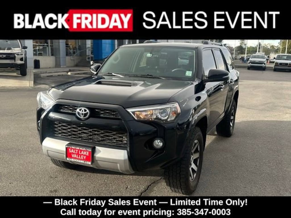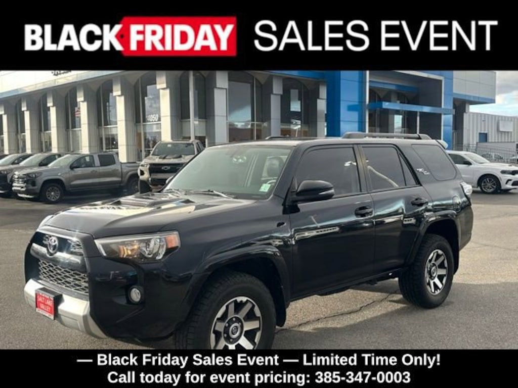 This Toyota 4Runner is packed with all your favorite features and includes a $1,000 finance savings, already included into the sale price, when you finance through one of our trusted lending partners! Explore more quality vehicles at www.slvchevrolet.com or call 801-969-8221 today! Enjoy the great options on this 4Runner like 3.727 Axle Ratio, 4-Wheel Disc Brakes, 8 Speakers, ABS brakes, Air Conditioning, Alloy wheels, AM/FM radio: SiriusXM, Anti-whiplash front head restraints, Auto-Dimming Rear-View Mirror, Auto-dimming Rear-View mirror, Black Roof Rails, Body Color Heated Mirrors, Brake assist, Bumpers: body-color, CD player, Compass, Driver door bin, Driver vanity mirror, Dual front impact airbags, Dual front side impact airbags, Electronic Stability Control, Emergency communication system: Safety Connect, Exterior Parking Camera Rear, Front anti-roll bar, Front Bucket Seats, Front Center Armrest, Front fog lights, Front reading lights, Front wheel independent suspension, Garage Door Opener, Garage door transmitter: HomeLink, Heated door mirrors, Heated Front Bucket Seats, Heated front seats, Illuminated entry, Knee airbag, Leather Shift Knob, Low tire pressure warning, Moonroof w/Tilt Up & Slide, Navigation System, Occupant sensing airbag, Outside temperature display, Overhead airbag, Overhead console, Panic alarm, Passenger door bin, Passenger vanity mirror, Power door mirrors, Power driver seat, Power passenger seat, Power steering, Power windows, Radio: Entune Premium Audio w/Navigation, Rear anti-roll bar, Rear seat center armrest, Rear window defroster, Rear window wiper, Remote keyless entry, Roof rack: rails only, Security system, Softex Synthetic Leather Seat Trim, Speed control, Speed-sensing steering, Split folding rear seat, Spoiler, Steering wheel mounted audio controls, Tachometer, Telescoping steering wheel, Tilt steering wheel, Traction control, Trip computer, Turn signal indicator mirrors, Variably intermittent wipers, and Wheels: 17 x 7.5 7-Spoke Unique Off-Road Alloy.