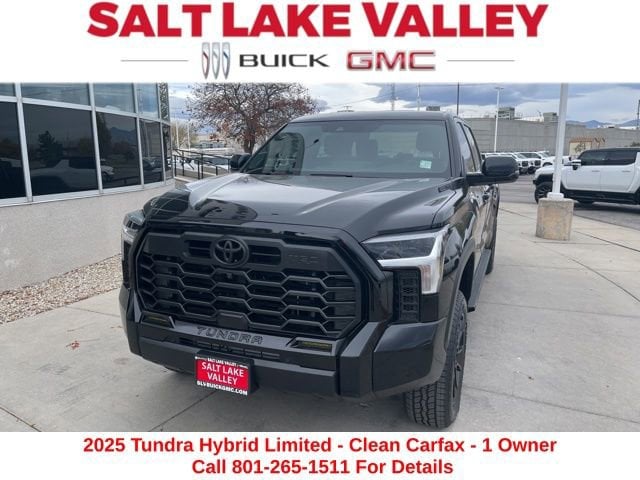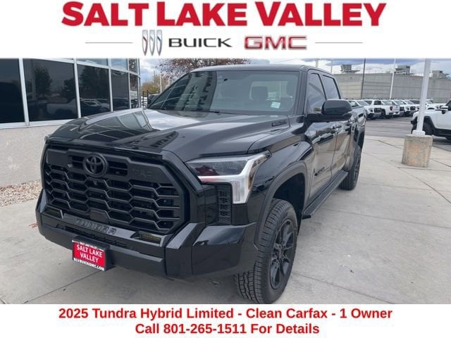 Take your drives to the next level with this Toyota Tundra Hybrid from Salt Lake Valley Buick GMC! Engineered for a smooth ride, advanced convenience, and lasting dependability, this vehicle is ready to handle everything your day throws at you. Plus, enjoy a $1,000 finance savings, already included in the sale price, when you finance through one of our trusted lending partners. Looking for quality used cars in Salt Lake City? This Toyota Tundra Hybrid delivers style, versatility, and value - perfect for daily commutes, family trips, or weekend adventures. Stop by Salt Lake Valley Buick GMC to see this vehicle in person and explore our wide selection of pre-owned cars, trucks, and SUVs. Browse online at www.slvbuickgmc.com or call 801-265-1511 to schedule your test drive today! With 20 x 8 Alloy Wheels, 3.31 Axle Ratio, 4-Wheel Disc Brakes, 9 Speakers, ABS brakes, Air Conditioning, Alloy wheels, AM/FM radio: SiriusXM, Apple CarPlay/Android Auto, Auto High-beam Headlights, Auto-dimming door mirrors, Auto-dimming Rear-View mirror, Automatic temperature control, Brake assist, Bumpers: body-color, Delay-off headlights, Driver door bin, Driver vanity mirror, Dual front impact airbags, Dual front side impact airbags, Electronic Stability Control, Emergency communication system: Safety Connect (10-year trial), Exterior Parking Camera Rear, Front anti-roll bar, Front Bucket Seats, Front Center Armrest, Front dual zone A/C, Front fog lights, Front reading lights, Front wheel independent suspension, Fully automatic headlights, Garage door transmitter: HomeLink, Heated & Ventilated Front Bucket Seats, Heated door mirrors, Heated front seats, Heated steering wheel, Illuminated entry, Knee airbag, Leather Shift Knob, Leather steering wheel, Low tire pressure warning, Memory seat, Navigation System, Occupant sensing airbag, Outside temperature display, Overhead airbag, Overhead console, Panic alarm, Passenger door bin, Passenger vanity mirror, Power door mirrors, Power driver seat, Power passenger seat, Power steering, Power windows, Radio data system, Radio: Audio Plus, Radio: Premium Audio w/JBL, Rear reading lights, Rear seat center armrest, Rear step bumper, Rear window defroster, Remote keyless entry, Security system, SofTex Seat Trim, Speed control, Speed-sensing steering, Split folding rear seat, Steering wheel mounted audio controls, Tachometer, Telescoping steering wheel, Tilt steering wheel, Traction control, Trip computer, Turn signal indicator mirrors, Variably intermittent wipers, Ventilated front seats, and Voltmeter designed for convenience and enjoyment, this Toyota Tundra Hybrid is ready to take you wherever you want to go.CARFAX One-Owner.