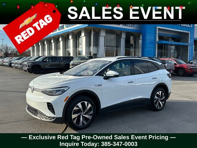 Turn every drive into something special with this Volkswagen ID.4 from Salt Lake Valley Chevrolet! Designed for comfort, performance, and style, this vehicle comes fully equipped with modern technology and convenience features youâll love. Plus, enjoy a $1,000 finance savings, already included in the sale price, when you finance through one of our trusted lending partners. If youâre shopping for used cars in Salt Lake City, or searching for the perfect SUV, truck, or sedan, this Volkswagen ID.4 delivers the dependability and value youâre looking for. Itâs the ideal match for your lifestyle - ready for everything from mountain adventures to city commutes. Visit Salt Lake Valley Chevrolet today and see why so many Utah drivers trust us for great deals on quality pre-owned vehicles. Explore our inventory online at www.slvchevy.com or call 801-969-8221 to schedule your test drive today! This impressive vehicle includes 2-in-1 (240V/120V) EV Charging Cable (DISC), 3.90 Axle Ratio, 4 Wheel Independent Suspension, 7 Speakers, ABS brakes, Air Conditioning, Alloy wheels, Auto High-beam Headlights, Auto-dimming Rear-View mirror, Automatic temperature control, Brake assist, Bumpers: body-color, Cloth Seating Surfaces, Delay-off headlights, Driver door bin, Driver vanity mirror, Driver's Seat Mounted Armrest, Dual front impact airbags, Dual front side impact airbags, Electronic Stability Control, Emergency communication system: VW Car-Net Safe & Secure 5-year, Exterior Parking Camera Rear, Four wheel independent suspension, Front anti-roll bar, Front Bucket Seats, Front dual zone A/C, Front reading lights, Fully automatic headlights, Heated door mirrors, Heated Front Seats, Heated front seats, Heavy Duty Trunk Liner w/VW CarGo Blocks, Illuminated entry, Low tire pressure warning, Navigation System, Occupant sensing airbag, Outside temperature display, Overhead airbag, Overhead console, Panic alarm, Passenger door bin, Passenger seat mounted armrest, Passenger vanity mirror, Power door mirrors, Power steering, Power windows, Radio data system, Radio: Discover Pro Max w/12 Touchscreen Nav, Rain sensing wipers, Rear anti-roll bar, Rear reading lights, Rear window defroster, Rear window wiper, Remote keyless entry, Rubber Mats Kit, Speed control, Speed-sensing steering, Split folding rear seat, Spoiler, Steering wheel mounted audio controls, Telescoping steering wheel, Tilt steering wheel, Traction control, Trip computer, Turn signal indicator mirrors, Variably intermittent wipers, VW Car-Net Safe & Secure 5-Year Plan, and Wheels: 19 2-Tone Machined Alloy, offering everything you need for your next adventure.